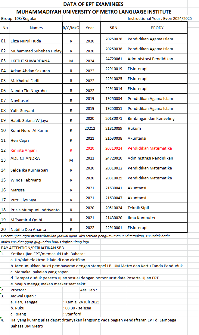 Jadwal EPT Grup 103 (22 Juli 2025)
