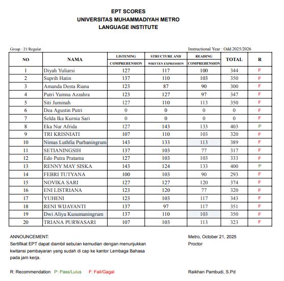 Nilai EPT Grup 21 (Rabu, 21 Oktober 2025)