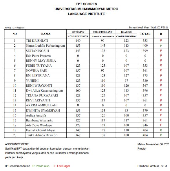 Nilai EPT Grup 23 (Kamis, 06 November 2025)