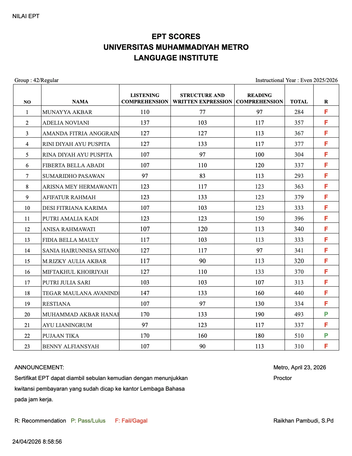 Nilai EPT Grup 42 (Kamis, 23 April 2026)