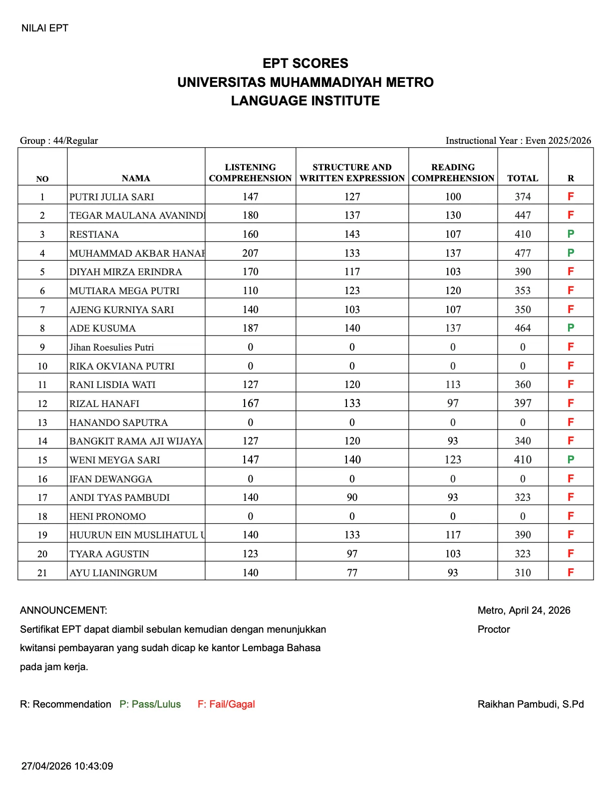 Nilai EPT Grup 44 (Jumat, 24 April 2026)