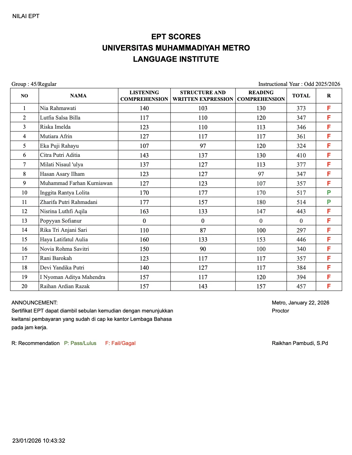 Nilai EPT Grup 45 (Kamis, 22 Januari 2026)