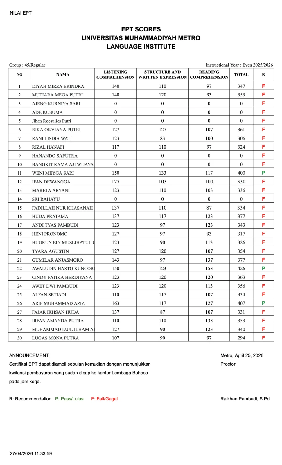 Nilai EPT Grup 45 (Senin, 27 April 2026)